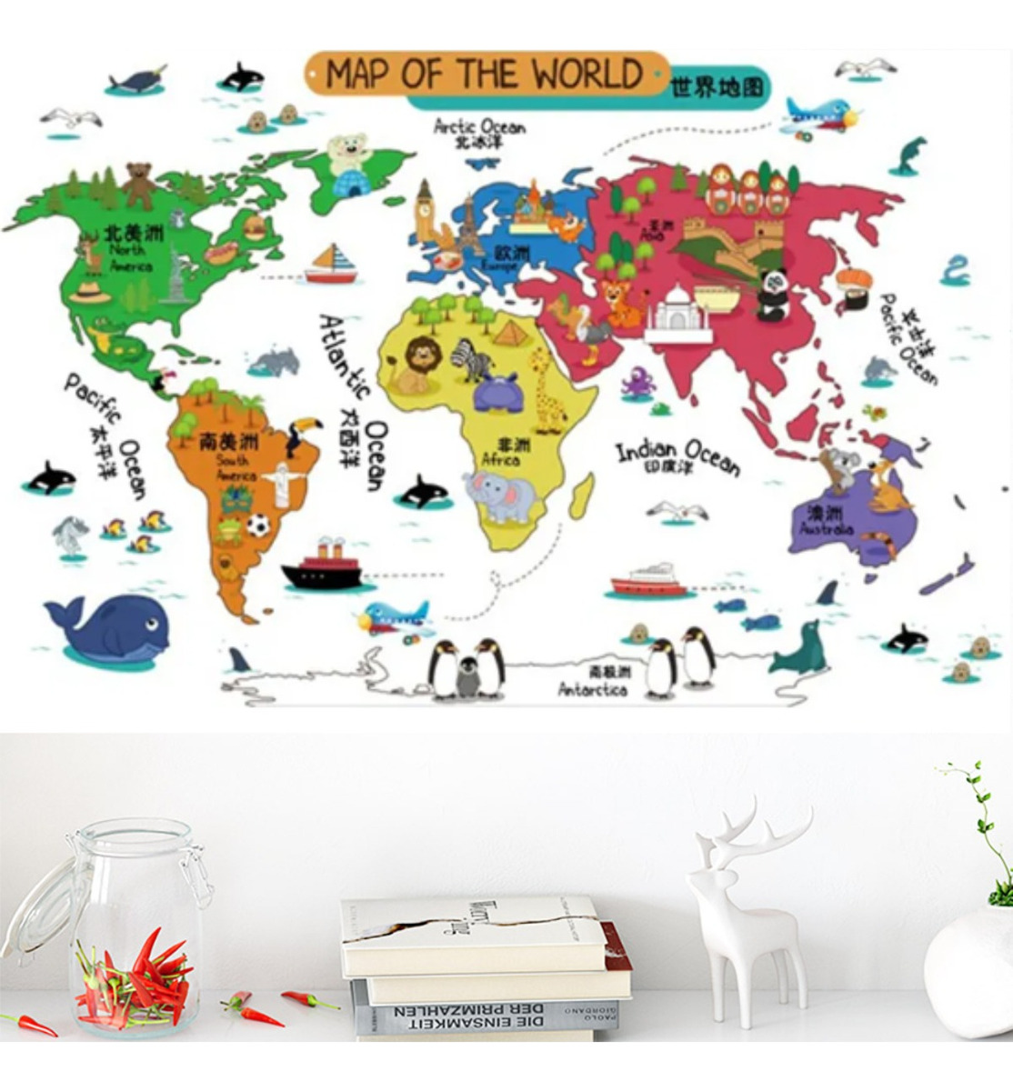 Vinilo de mapamundi con diseño de animales para pared, ideal para cuartos de niños/as, guarderías, etc. Fácil de colocar.